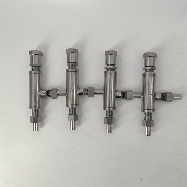 旋轉調壓螺塞,可使閥門穩壓部分的開啟壓力發生變化,當樣水壓力大于開啟壓力(設定壓力)時,部分水樣泄壓,通過閥門出口流出,水樣壓力低于設定壓力時,閥門自動泄壓保護。